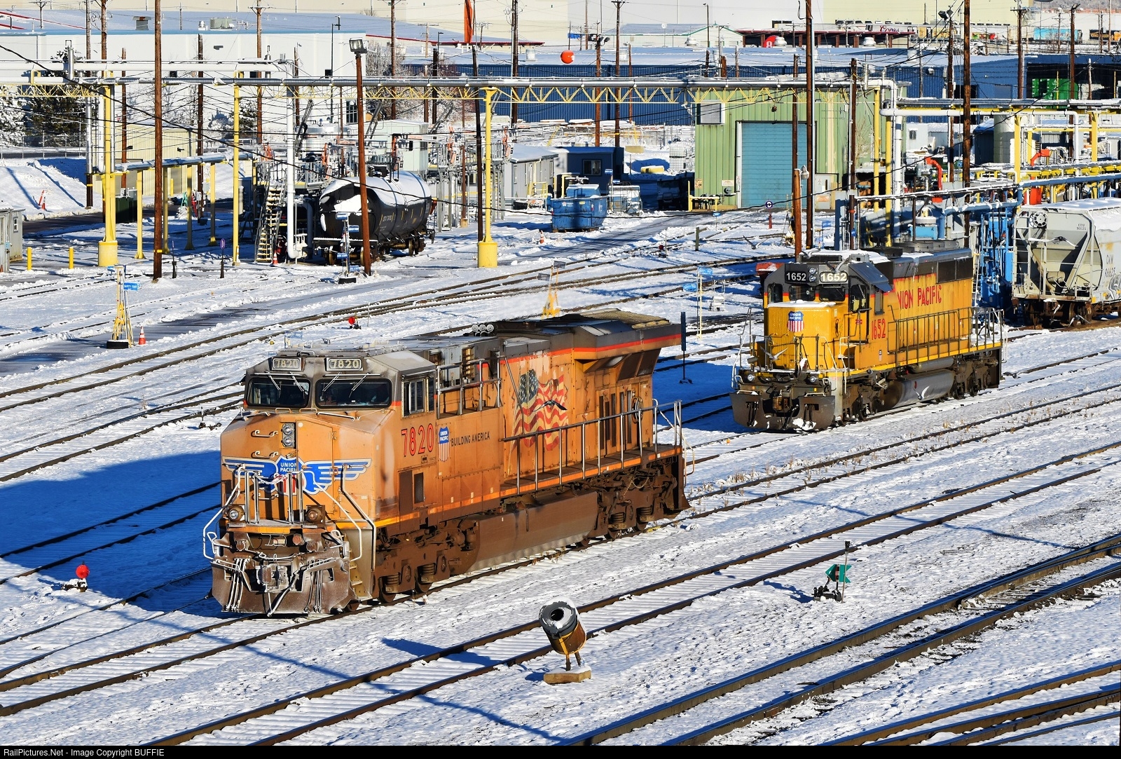 A frosty chinned UP 7820 (ES44AC) moves through the Union Pacific's North Yard in Denver, Colorado.