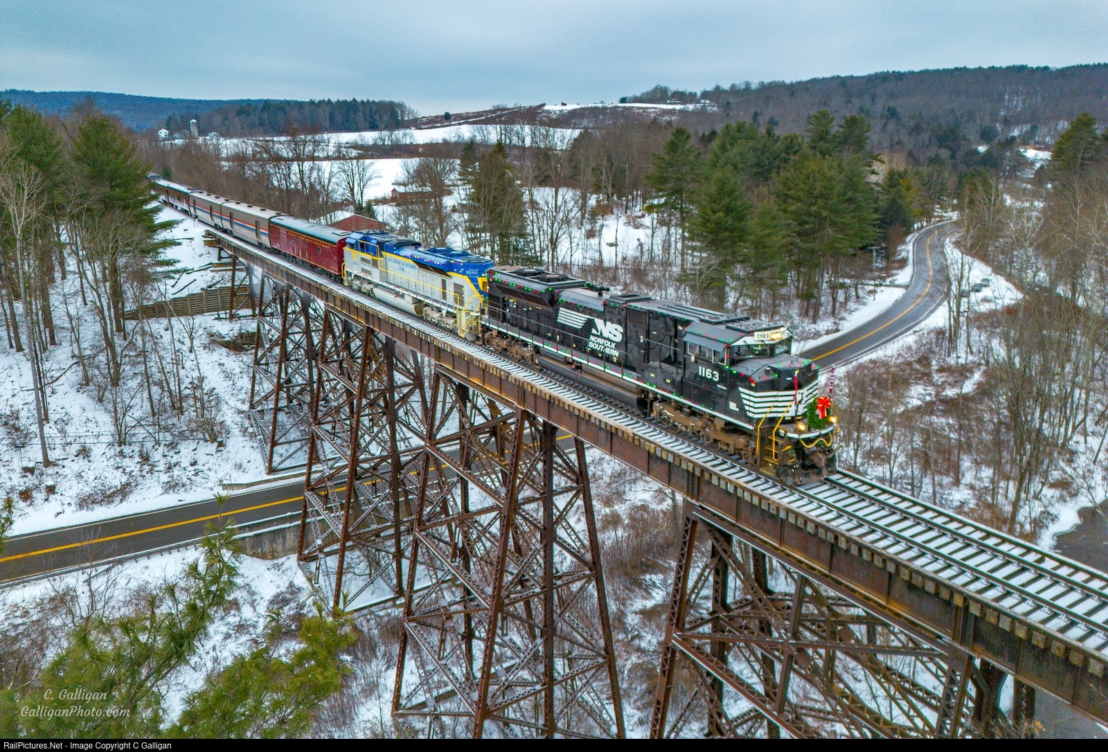 Not to be confused with the Delaware and Hudson, Norfolk Southern SD70ACe 1163 leads Office Car Special 956 over the Harpursville Trestle with the 2025 Toys for Tots train.