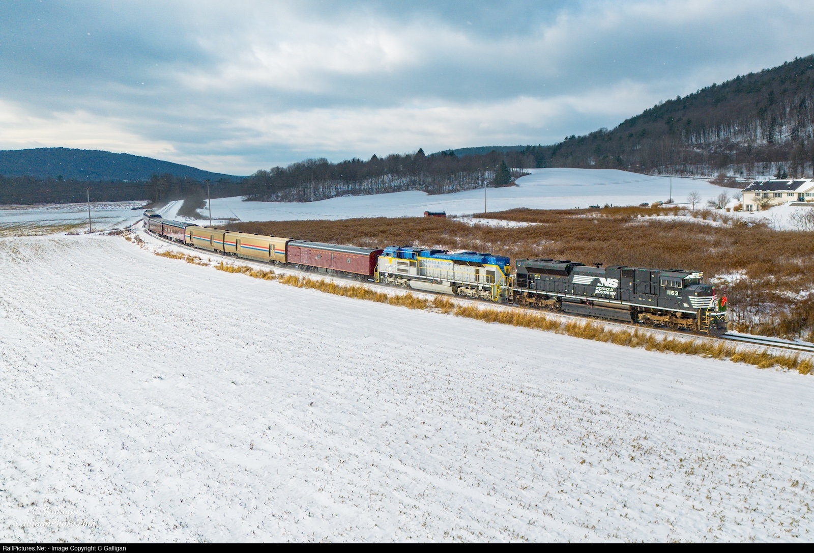 | Norfolk Southern Office Car Special 956 hustles through the fields of Otego, NY with the 2025 NS, Amtrak, and Marine Corps Toys for Tots train. |