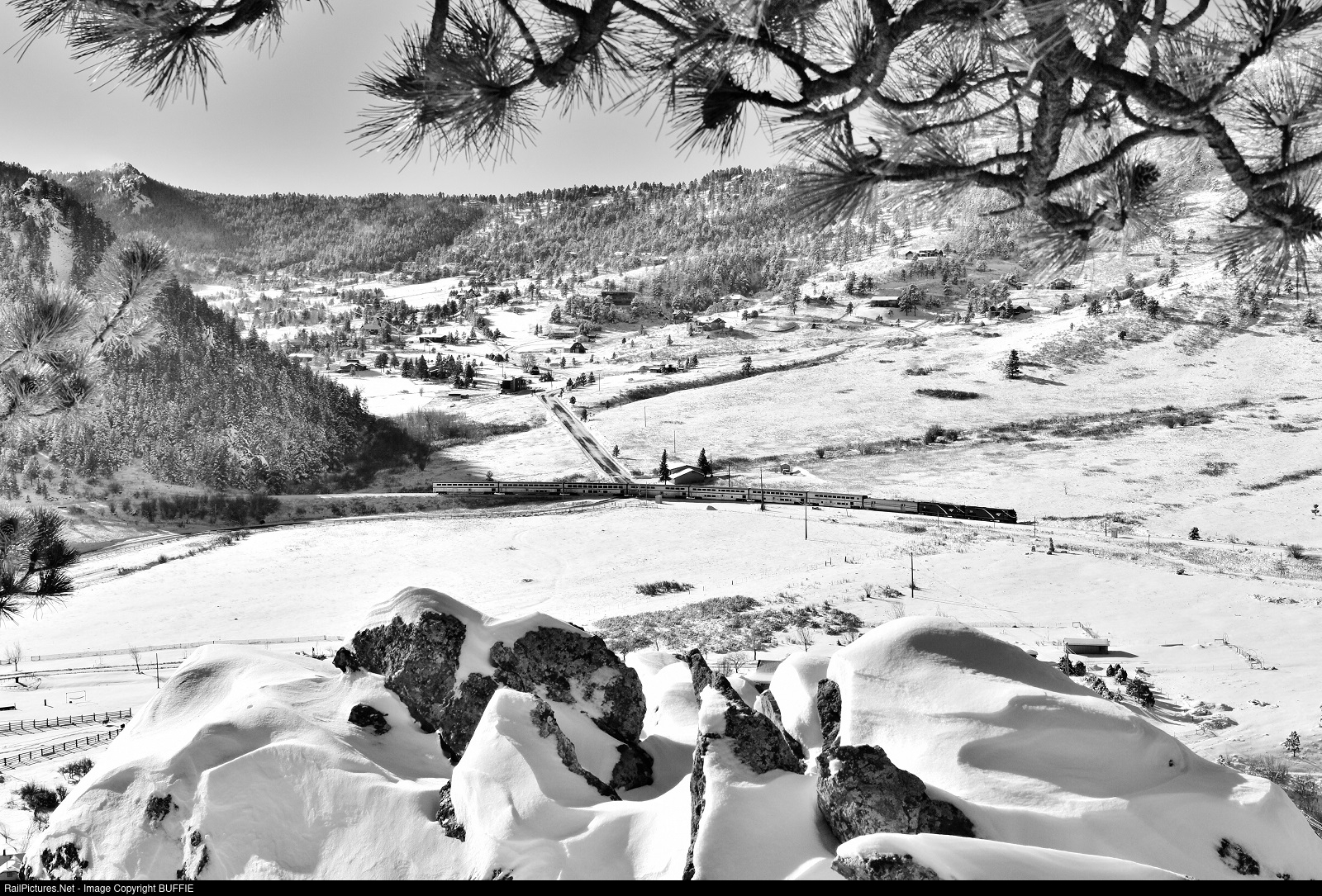 Two Phase VII engines lead the California Zephyr through a snowy Coal Creek Canyon as it heads west into the Colorado Rocky Mountains on the Moffat Tunnel Sub.