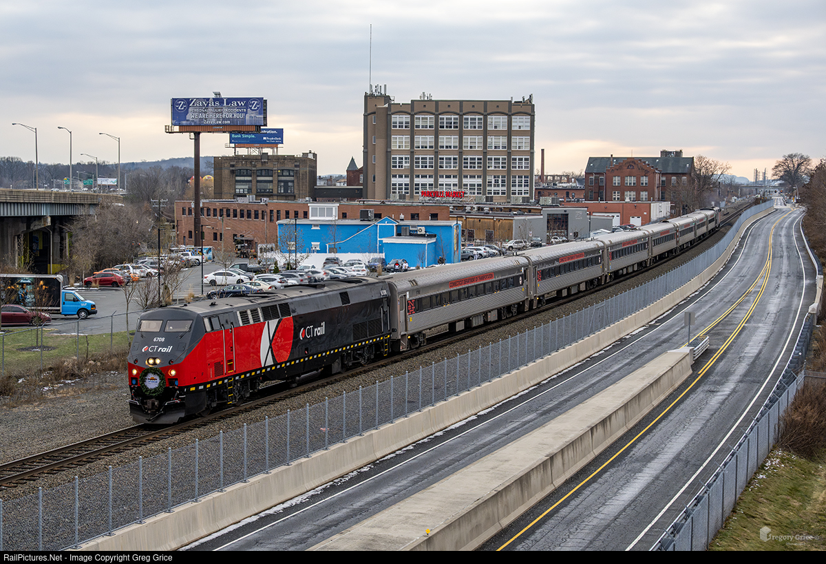 The Candy Cane Express, led by CTrail P40BH #6708, passes the Parkville area of Hartford, Connecticut as it heads north up the MRS (Hartford) Line.