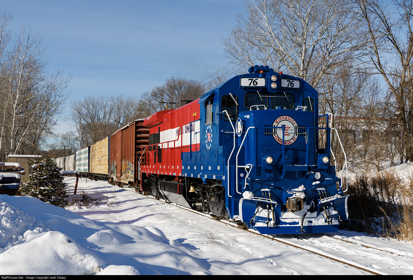 | MNNR 76 leads the Hugo Job through Little Canada. After operating in patched TTI paint for over 2 years, the 76 was repainted into this sharp Semiquincentennial commemorative scheme. |