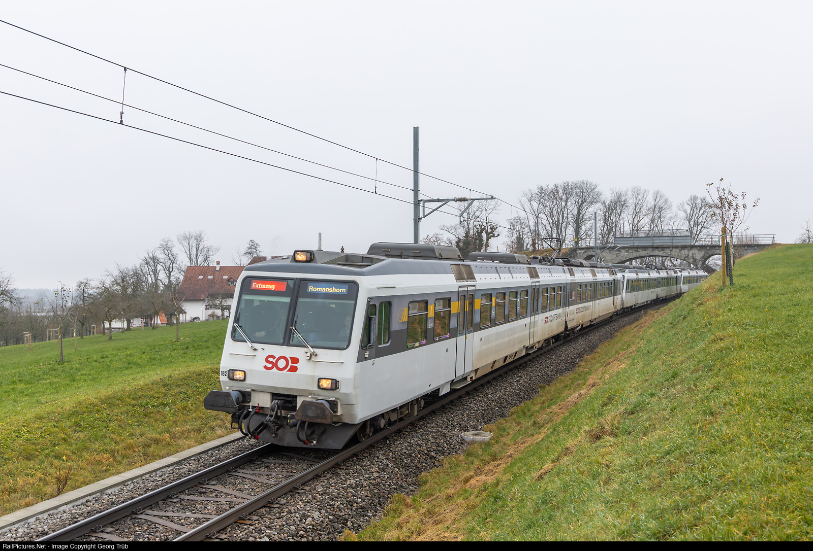 In 1995, Südostbahn procured four “NPZ” (new commuter trains) consisting of an RBDe 566 railcar and a control car with 1st and 2nd class ABt. After 30 years of service, they were taken out of service in October 2025. In recent years, they were still running on the S 27 “March Shuttle” (Siebnen-Wangen–Ziegelbrücke). A newly founded operating group, “SOB RBDe 566 NPZ,” has taken over a two-car train and will use it for special trips. The farewell trip, together with two other two-car NPZ trains that were sold to Austria, ran from Einsiedeln via Pfäffikon SZ-Rapperswil-Wattwil-St. Gallen-Romanshorn-Rorschach-Buchs SG-Sargans and back to Einsiedeln. Train 31133, with leading cab car ABt # 182 and railcar RBDe 561 # 082, is on its way between Häggenschwil-Winden and Muolen to Lake Constance.