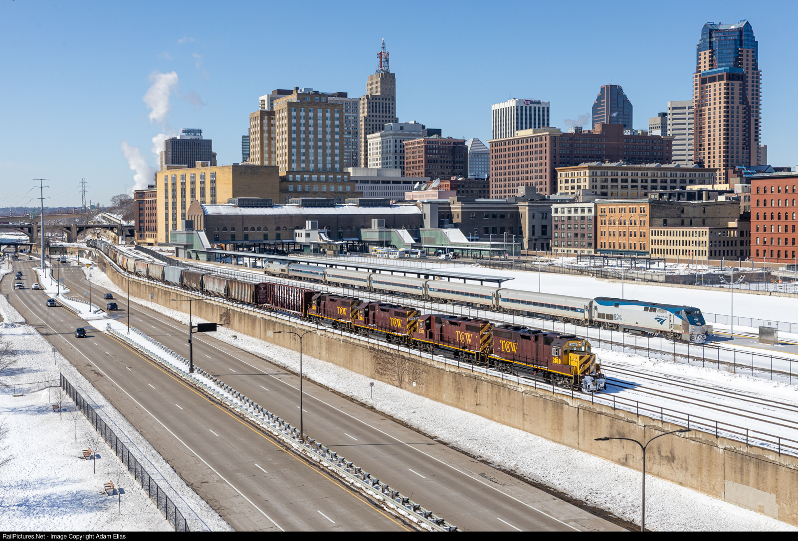 The TCW job to the UP passing by the skyline of Minneapolis-St. Paul. On the right side is the Amtrak Borealis train to Chicago. They were beginning their shove into the station for boarding.