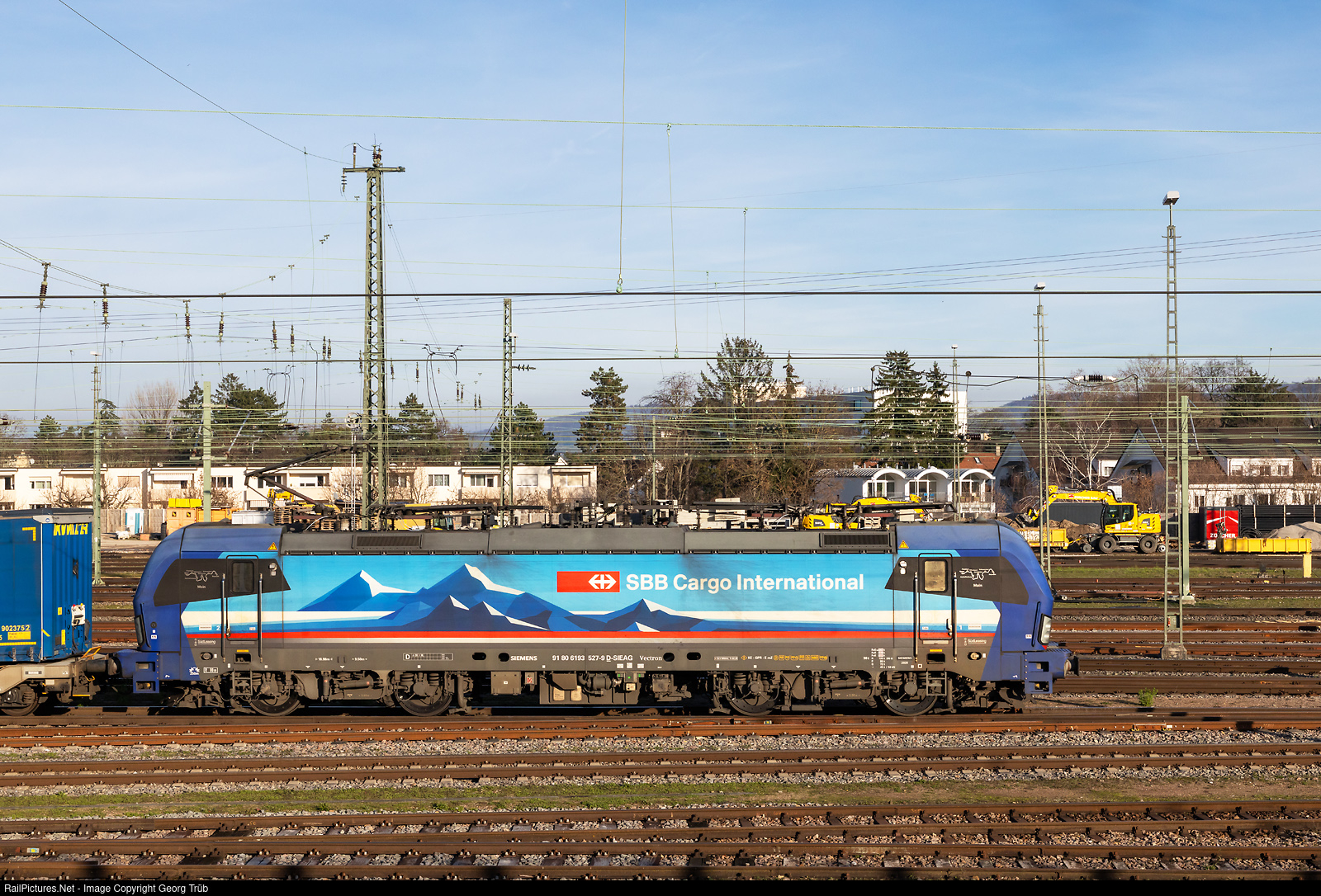 | Siemens "Vectron" 193 # 527 "Main" of the SBB Cargo International, rented from SüdLeasing, is running through Basel Badischer Bahnhof with southbound intermodal train 43623 from Freiburg im Breisgau/Germany via Lötschberg base tunnel-Simplon to Domodossola/Italy.. |