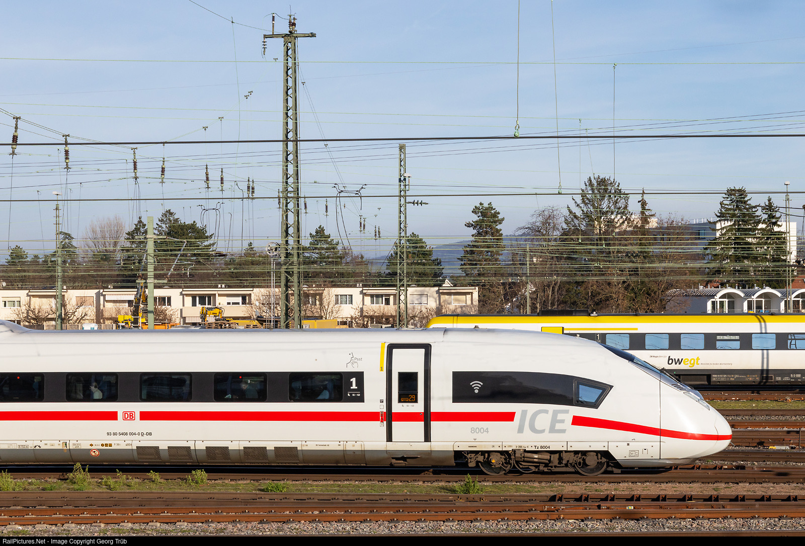ICE 3neo # 8004 of the Deutsche Bahn, a "Siemens Velaro" 8-car highspeed train for 320 km/h, is entering Basel Badischer Bahnhof, running as ICE 2852 from Basel SBB via Mannheim-Frankfurt-Kassel-Braunschweig to Berlin Ostbahnhof. The train, built in 2022, is approved for Germany, Belgium and Netherland and is replacing an ICE 4 as ICE 276.