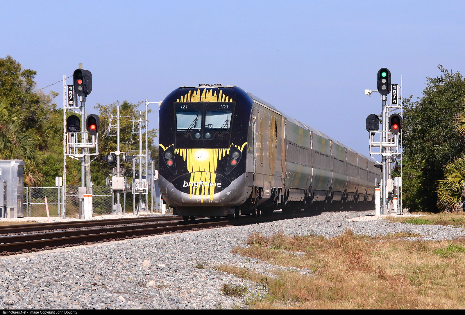 | Brightline 121 is the trailing unit on a Brightline passenger train as it races north through Palm Bay, Florida. |