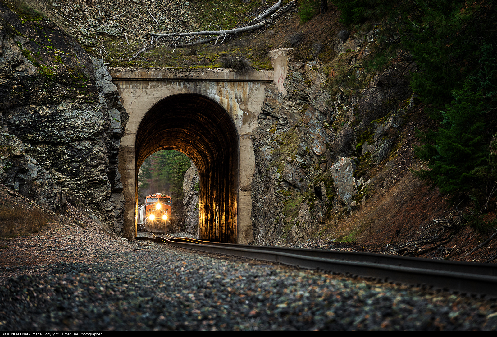 | The walls of Tunnel 5.5 are illuminated by the headlights on the lead locomotive of a westbound grain train which is approaching the community of Cyr, MT late in the afternoon of Sunday, December 14, 2025 on BNSF's MRL 4th Subdivision.