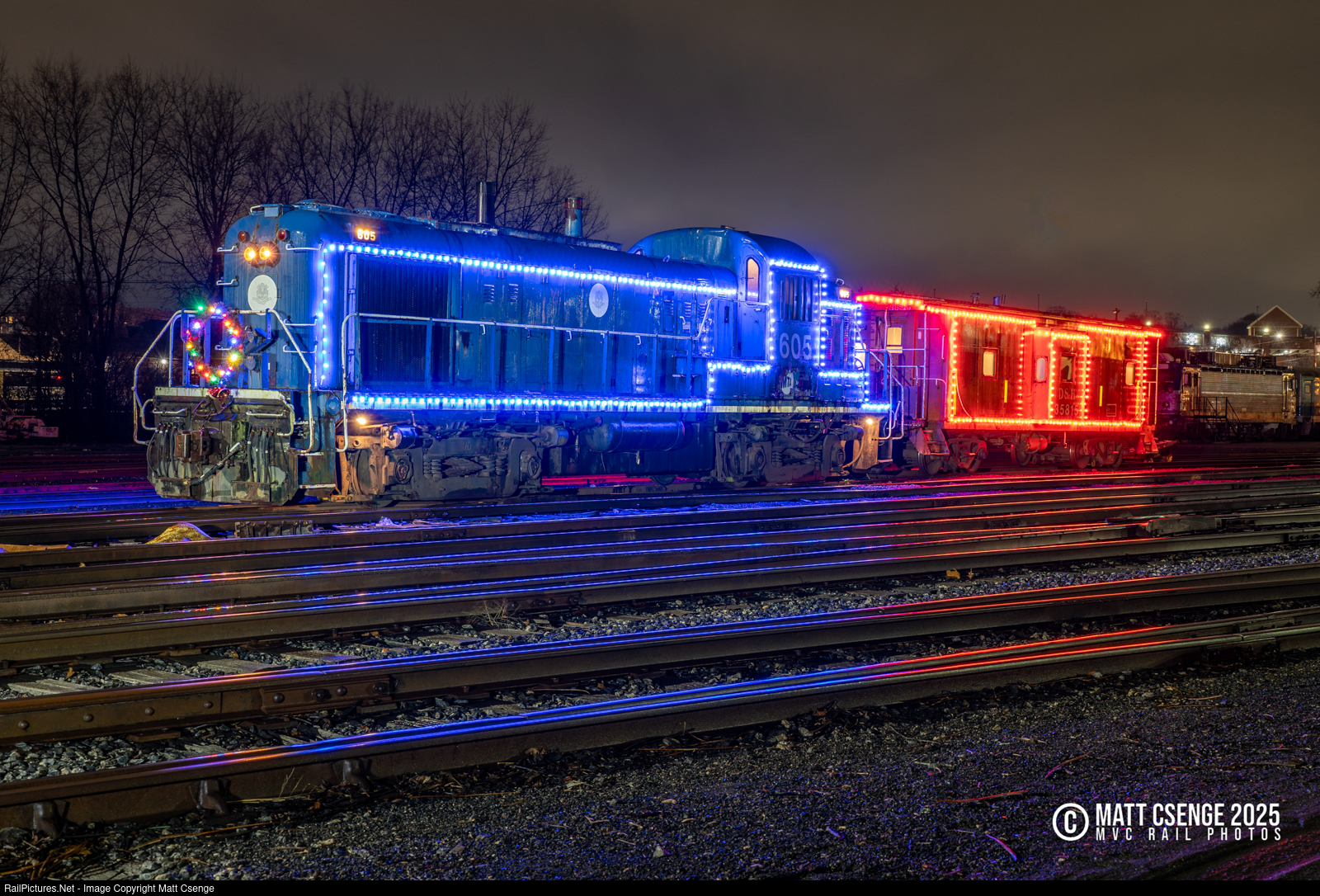 Connecticut Department of Transportation (CDOT) RS-3m no. 605 and Delaware & Hudson (DH) caboose 35815 are seen in the yard at the Danbury Railway Museum, lit up in lights of their respective colors for the holiday season. |
