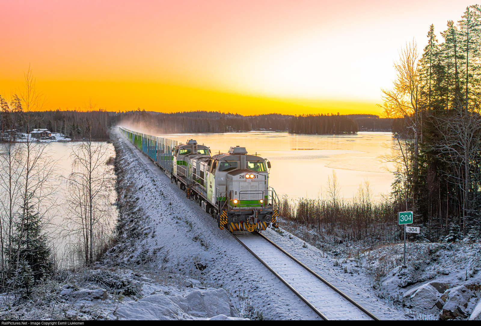 | A bright winter morning has erupted on the scenes of Tyrisevä Lake near Haapamäki, as two class Dv12 diesel hydraulic locomotives are pulling empty timber wagons to Alavus. |