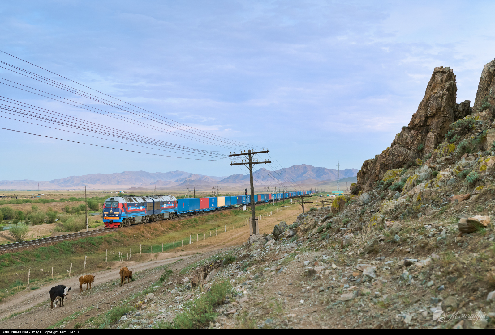 | Early summer morning in the Kharaa River Valley and Berkh mountains. A mixed intermodal freight hauled by 2TE25KM locomotive passes Berkh Station en route to Zuunkharaa, a key operational point where locomotive crew changes are carried out and heavy-tonnage freight trains are re-marshalled and split for further operation to Ulaanbaatar. Photographed during a private group-tour with Czech railfans, on the northern section of the Trans-Mongolian Railway. Contact and Inquire tours: monrailpic@gmail.com |
