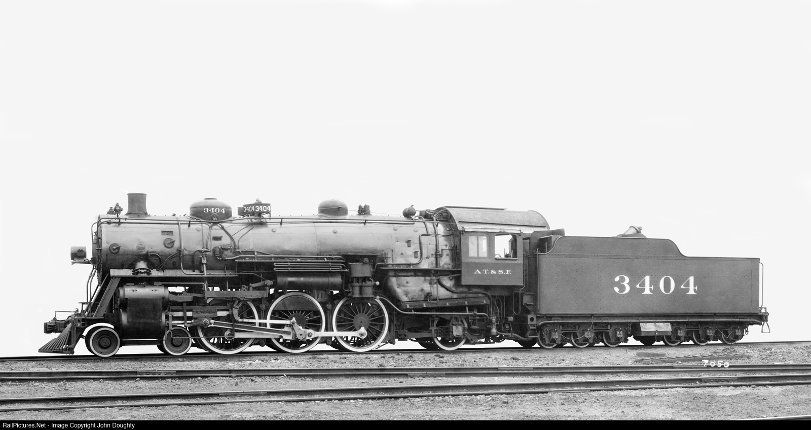 This 4-6-2 steam locomotive, number 3404, was built by the Baldwin Locomotive Works for the Atchison, Topeka & Santa Fe Railway. It had a total engine and tender weight of 534,670 lbs., and a tractive force of 43,300 lbs. The BLW construction number was 51,594. It was built in Eddystone, Pennsylvania, where my great, great Uncle Robert F. McKee, Sr., worked as a design engineer at Baldwin. This Baldwin Locomotive Works builders photo card is from the John R. Doughty collection.