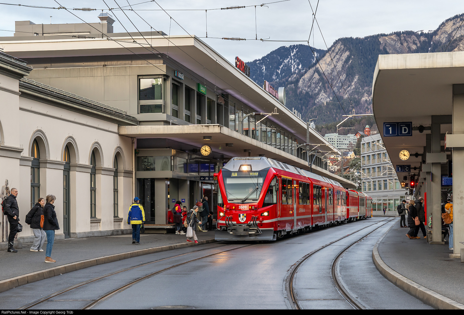 | "Allegra" ABe 8/12 # 3509 of the Rhaetian Railway is ready in Chur on track 2 on the station square with the regional train 1453 of the line R16 to Arosa. This is a push-pull train with cab car Bt in the rear. |