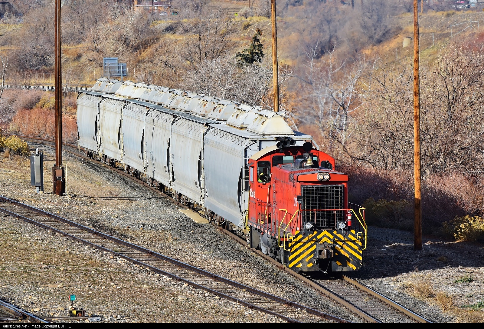 | The Coors Brewery operates a fifty-year-old SW1001 as it shuffles specially designed hoppers to and from the silo and the manufacturing plant in Golden, Colorado.