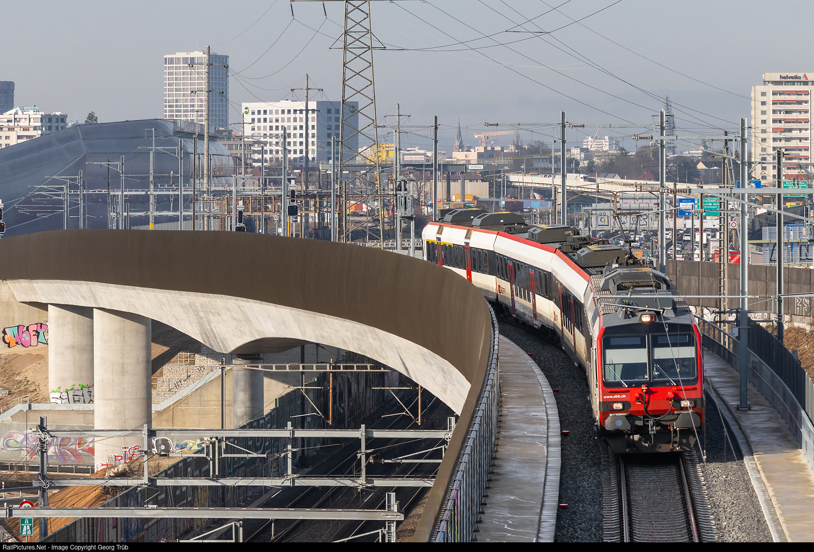 With the timetable change on December 14, the new connection from Basel SBB via the freight station with the 360-meter-long Donnerbaum Bridge to Muttenz was officially put into operation. As a rule, two Interregio and six S-Bahn trains run hourly on this new route, which crosses the three-track main line from Basel SBB to Muttenz. The newly introduced S33 line runs every half hour between Basel SBB and Liestal, supplementing the existing S3 Laufen-Basel-Olten line and thus providing a quarter-hourly service between Basel and Liestal. Train 17539 of the S33, a four-car Domino push-pull train with RBDe 560 railcar, is on its way to Muttenz on the Donnerbaum Bridge.