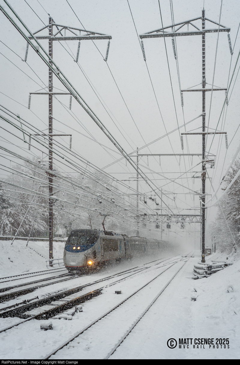 Amtrak Acela power car 2011 is seen leading train 2205 through Lincoln Interlocking as it flies through the snow towards Washington DC.