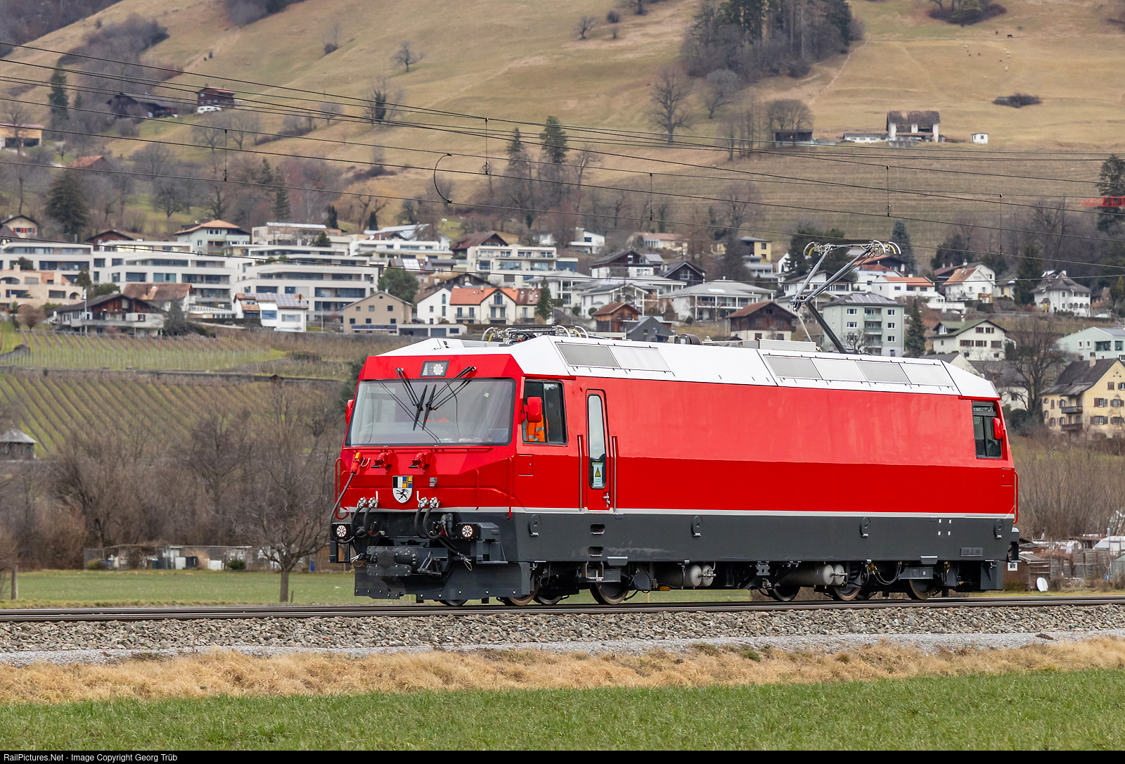 | What looks like a new locomotive fresh from the factory, still without any markings, is in fact a locomotive that is over 30 years old. It was delivered in 1994 by SLM and ABB as Ge 4/4 # 8003 for 900 volts DC to the Montreux-Oberland Bernois (MOB). It was sold to the Rhaetian Railway in 2019 as an addition to the 12 existing Ge 4/4 III # 641 to # 652 locomotives. The engineering and conversion took a very long time, as the locomotive is also to serve as a prototype for a refit program for the existing locomotives. The future Ge 4/4 III # 653 of the RhB is on a test run 9030 from Klosters Platz to Landquart, near Malans.