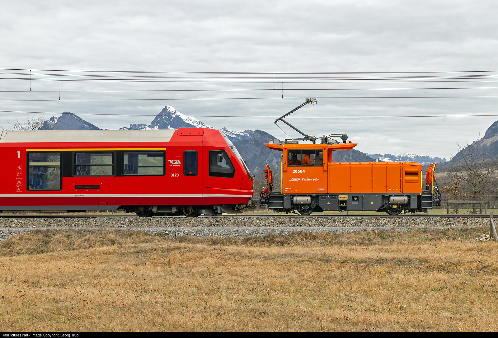 What you think you see here: The Rhätische Bahn's Geaf 2/2 # 20604 shunting locomotive, powered by electricity from the overhead line and a powerful battery, is pulling the “Capricorn” ABe 4/16 # 3123 “Piz Sesvenna.” In fact, the shunting locomotive is on a test run on the rear track of the double track between Landquart and Malans, and the “Capricorn” ABe 4/16 # 3123 is traveling as RE 1035 of Line RE13 to Klosters-Davos-Filisur and St.Moritz, on the front track of the double track towards Malans. The two vehicles also have different couplings: the ABe 4/16 has an automatic center buffer coupling, while the shunting locomotive has a conventional manual coupling with a center buffer.