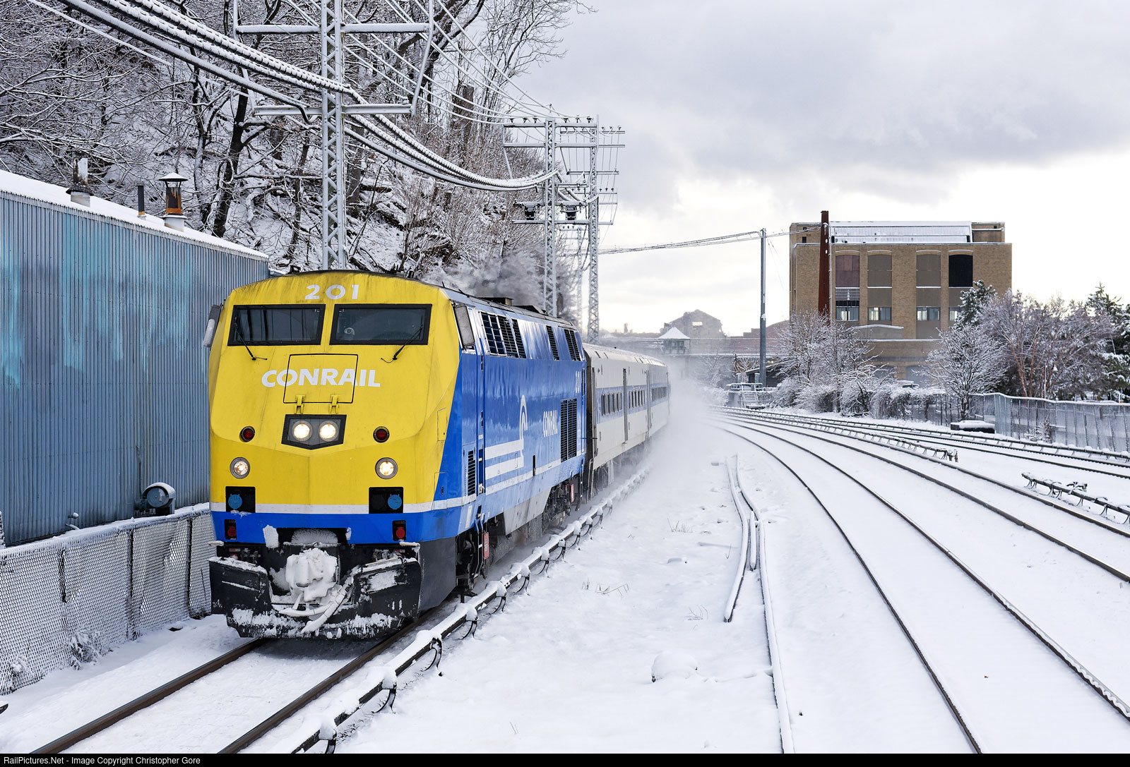 Metro-North's Conrail wrapped P32AC-DM 201 arrives at Ossining in the snow.