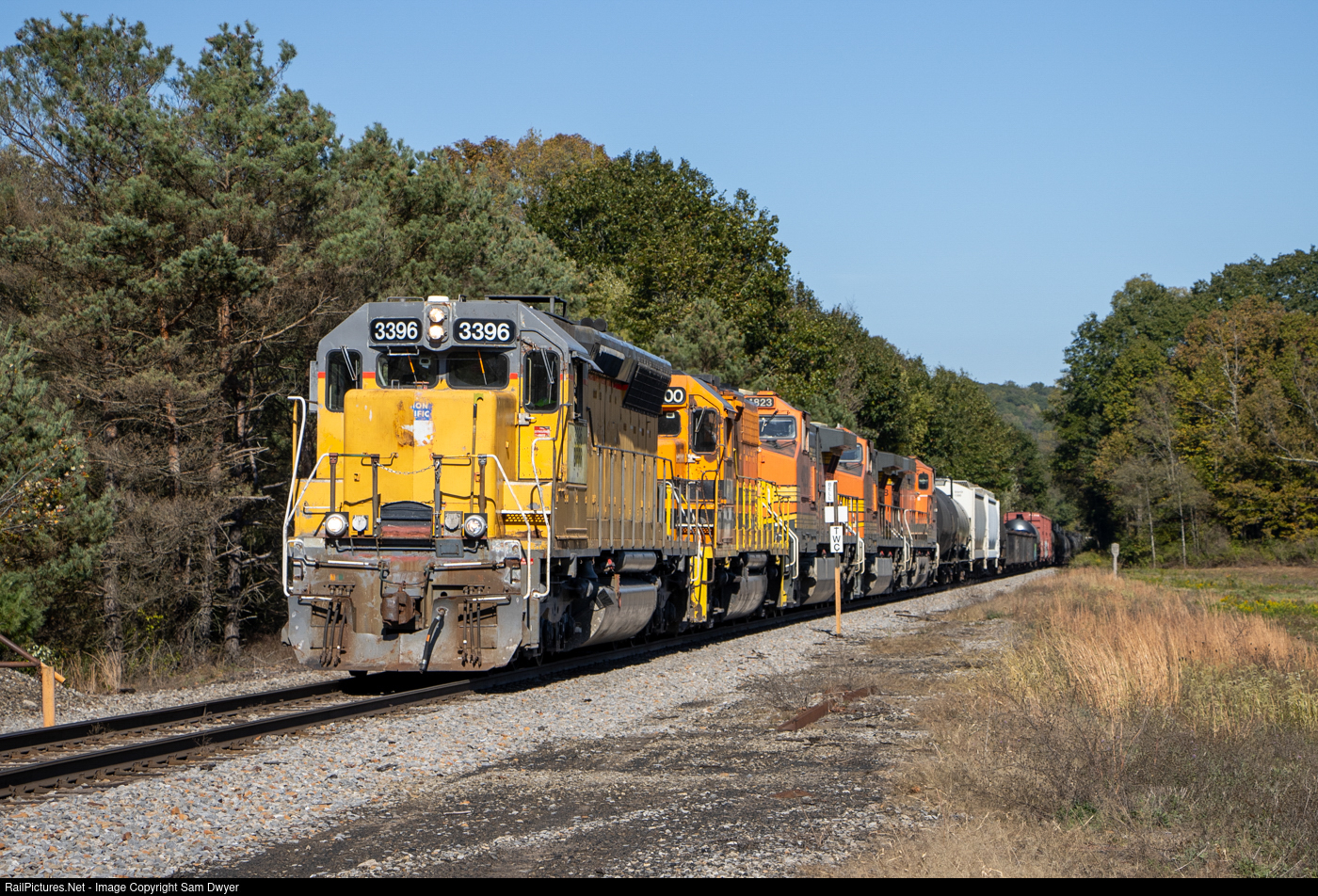 BPRR 3396, the last active 6-axle EMD on the Buffalo and Pittsburgh, leads SIRI (Salamanca, NY to Punxsutawney, PA) on the home stretch to Riker Yard. Though 3396 wears Union Pacific colors, it was built in 1968 as PRR SD45 #6192, and was one of the last locomotives the railroad took delivery of before the Penn Central merger. Nearly 60 years later, it's still running strong, now back in its home state of Pennsylvania. Since this photo was taken, it has been sent off to the Wellsboro & Corning Railroad, and its future is uncertain.