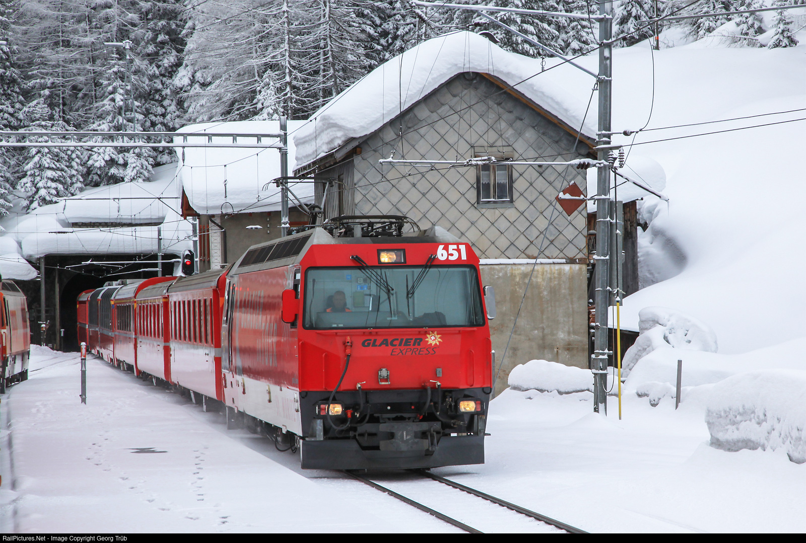 | Ge 4/4 III # 651 of the Rhaetian Railway in the Glacier Express paint scheme is leaving the Albula tunnel in Preda with Regio Express 1128 from St.Moritz to Chur. |