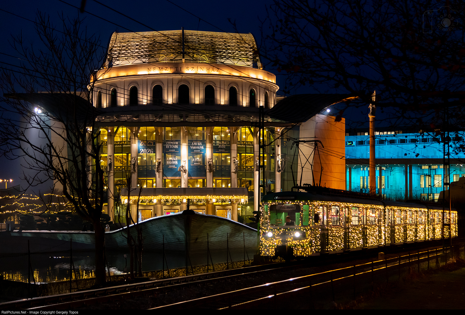 | This suburban railway train decorated with Christmas lights passes the illuminated National Theatre on the H7 line. |