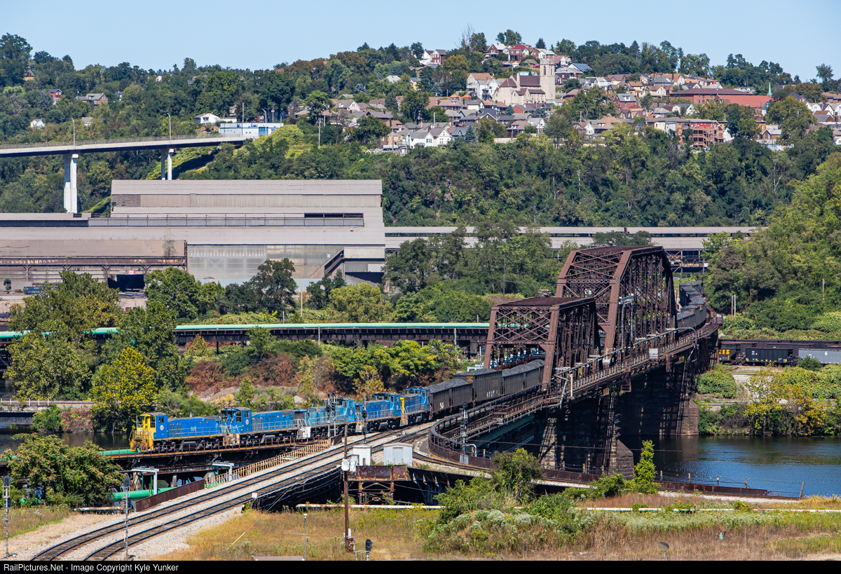 Five Union Railroad MP15DC's shove a coke train across the Monongahela River into the US Steel Edgar Thomson Works.