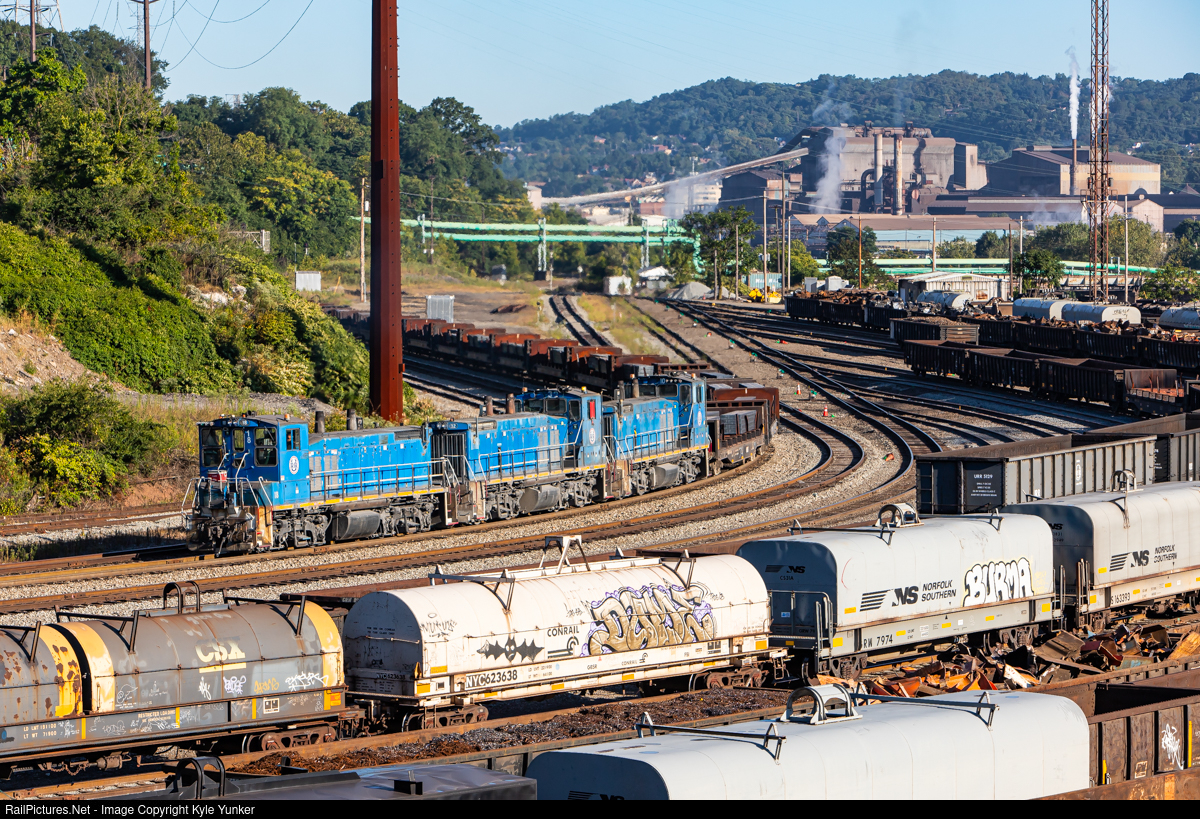 | A trio of Union Railroad MP15DC's bring a steel slab train by the yard at Duquesne, PA on its way to US Steel's Irvin Works. |