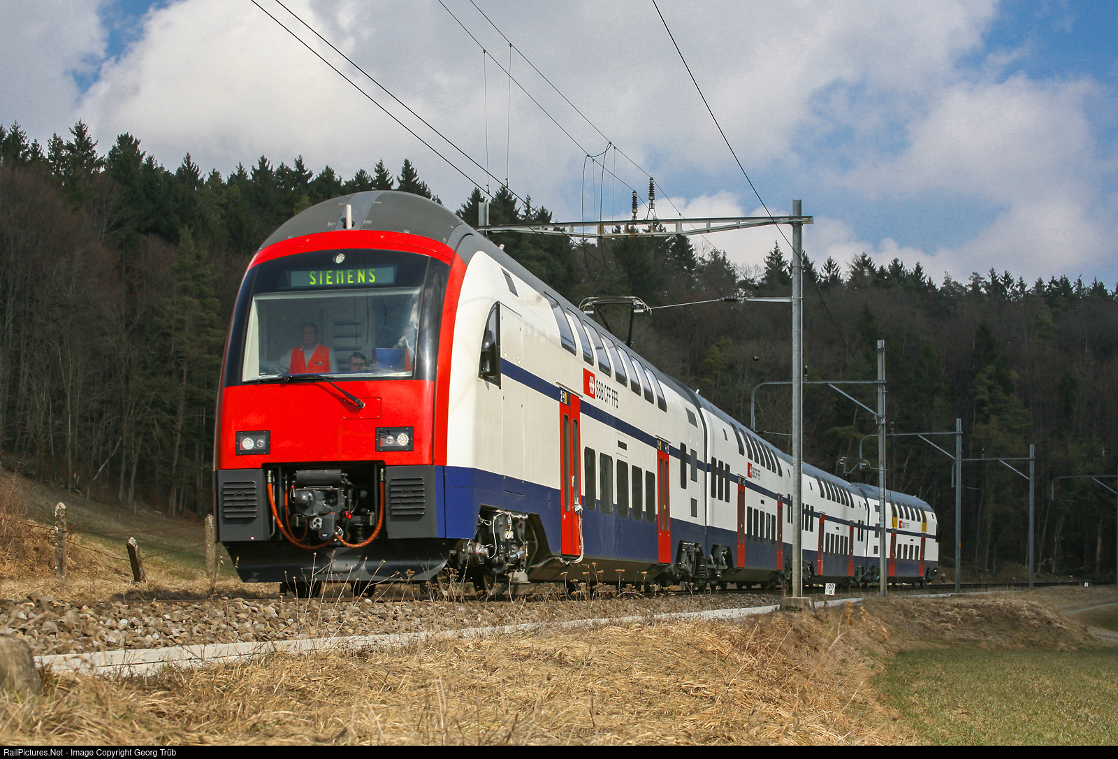 | Most new vehicles for SBB are also tested on the route between Oberwinterthur and Etzwilen, which has a large number of wide curves. Brand new doubledeck commuter train for the Zürich S-Bahn system from Siemens for the SBB, RABe 514 # 004 "DTZ" is on a test run between Stammheim and Ossingen. |