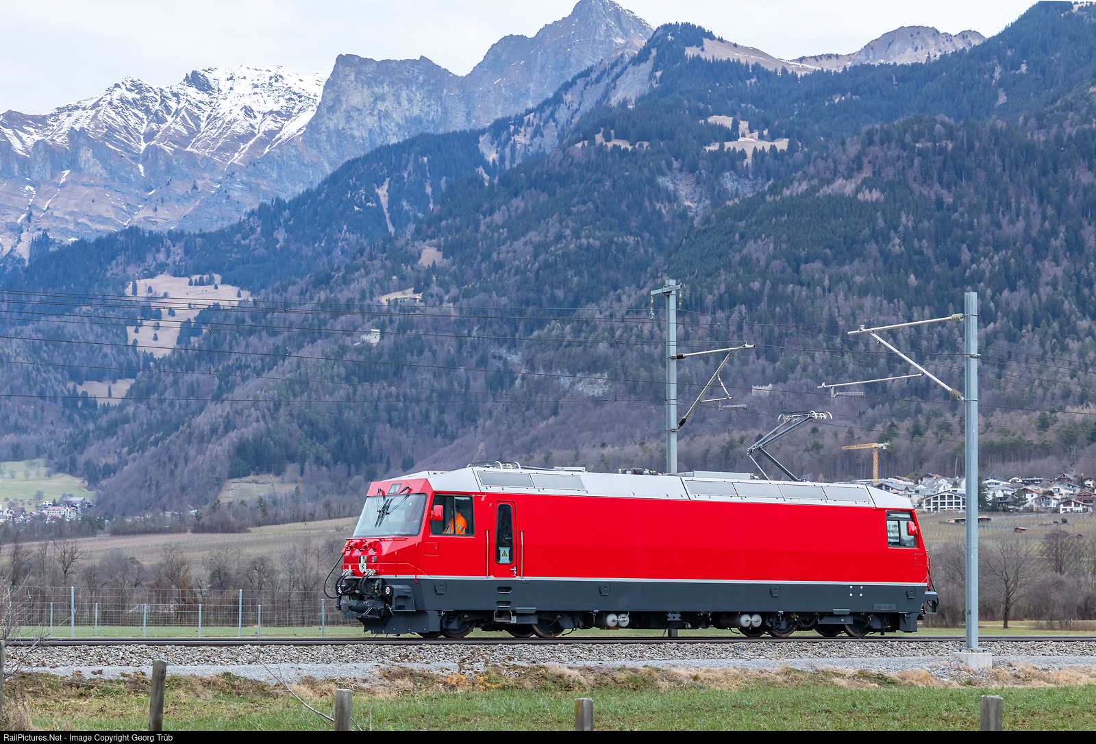 | What looks like a new locomotive fresh from the factory, still without any markings, is in fact a locomotive that is over 30 years old. It was delivered in 1994 by SLM and ABB as Ge 4/4 # 8003 for 900 volts DC to the Montreux-Oberland Bernois (MOB). It was sold to the Rhaetian Railway in 2019 as an addition to the 12 existing Ge 4/4 III # 641 to # 652 locomotives. The engineering and conversion took a very long time, as the locomotive is also to serve as a prototype for a refit program for the existing locomotives. The future Ge 4/4 III # 653 of the RhB is on a test run 9030 from Klosters Platz to Landquart, near Malans. |
