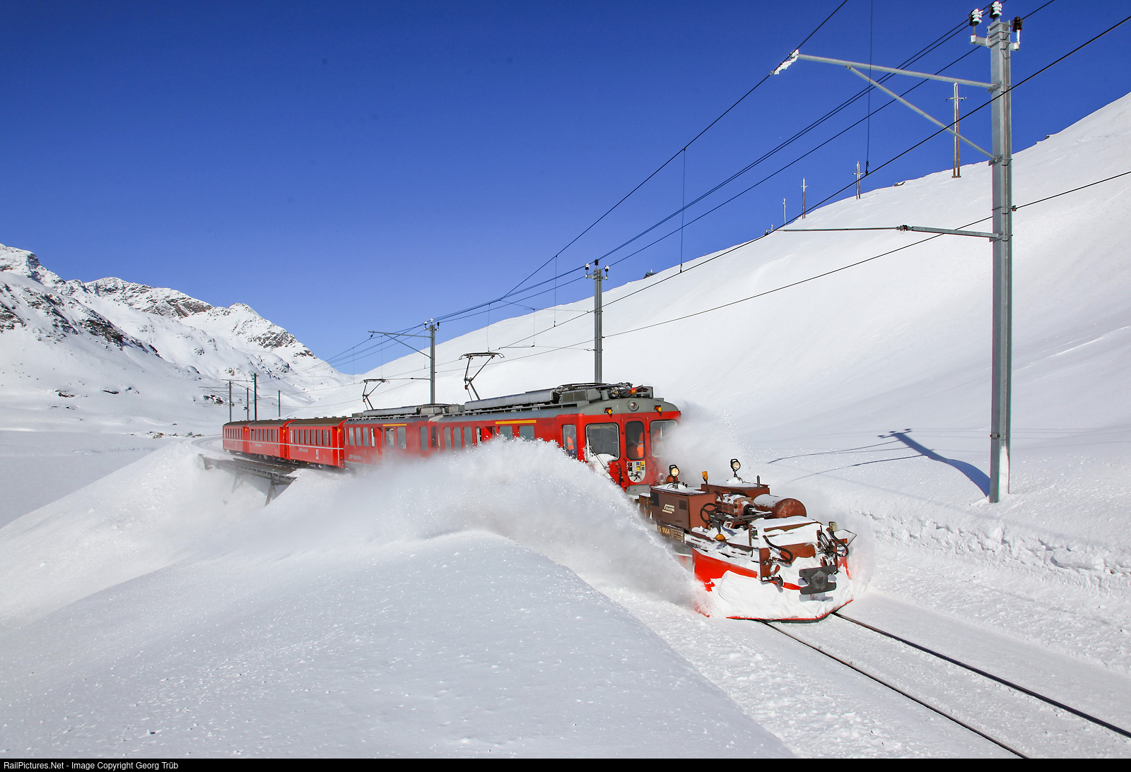 | Regular passenger train 1621 of the Bernina line from St.Moritz to Tirano with railcars ABe 4/4 # 49 and # 47 of the Rhaetain Railway in multiple control shoving snowplow Xk # 9144 in front, near the highest point of the line (2253 m a.s.l.) south of Ospizio Bernina. This special plow is used to clear the snow between the rails, about 5 centimetre below top of the rails. |