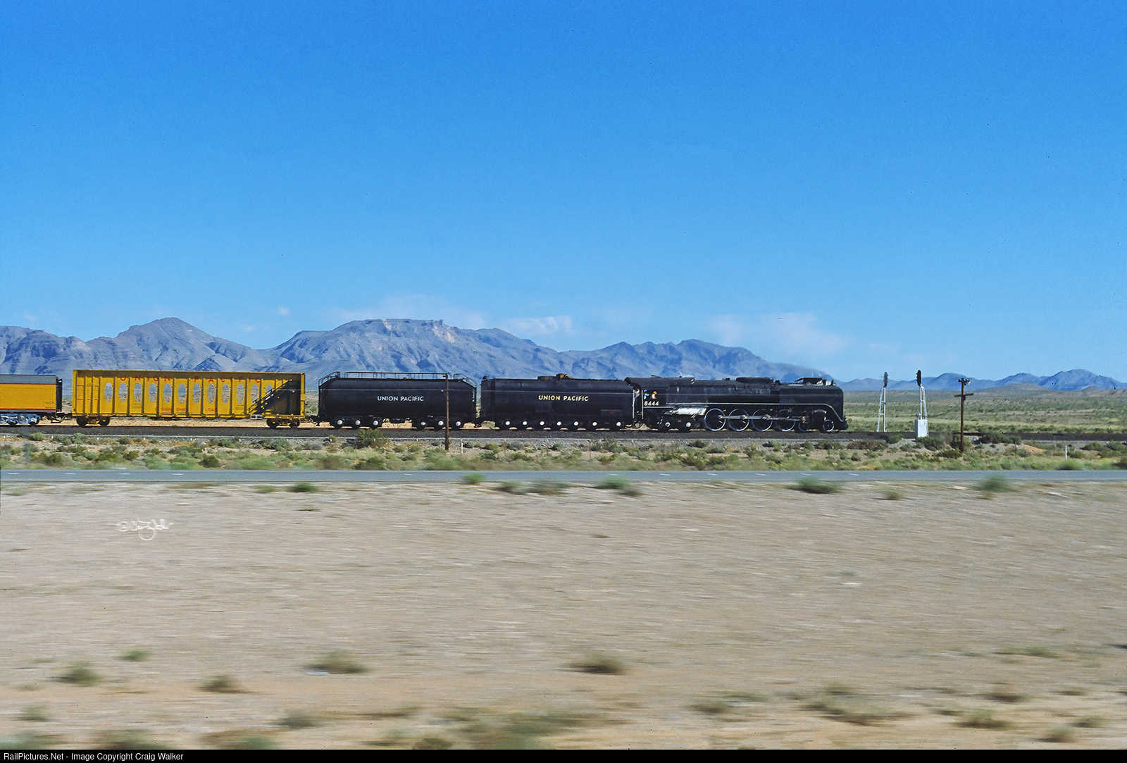 Highballing with a clean stack (why waste all that fuel making smoke for the 6 or so railfans that are trackside in this Nevada wasteland?), Union Pacific Railroad 4-8-4 8444 heads east after being on display in Las Vegas. A morning departure allows for nice light as it splits the signals on the UP's Caliente Sub on its way back across the desert heading to its home in Cheyenne, Wyoming. (Moapa, Nevada – May 18, 1980)