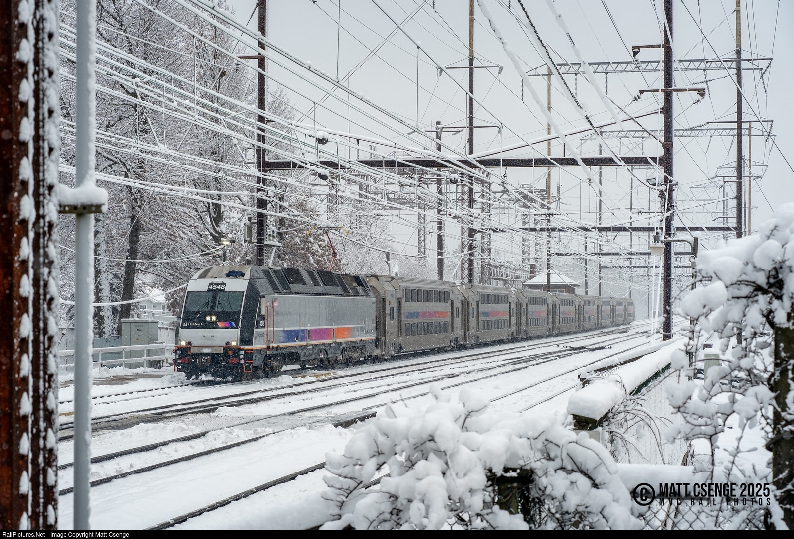 NJ Transit ALP-45A no. 4548 is on the head end of Northeast Corridor Line train 7824, seen slowing to its station stop at Metuchen. |