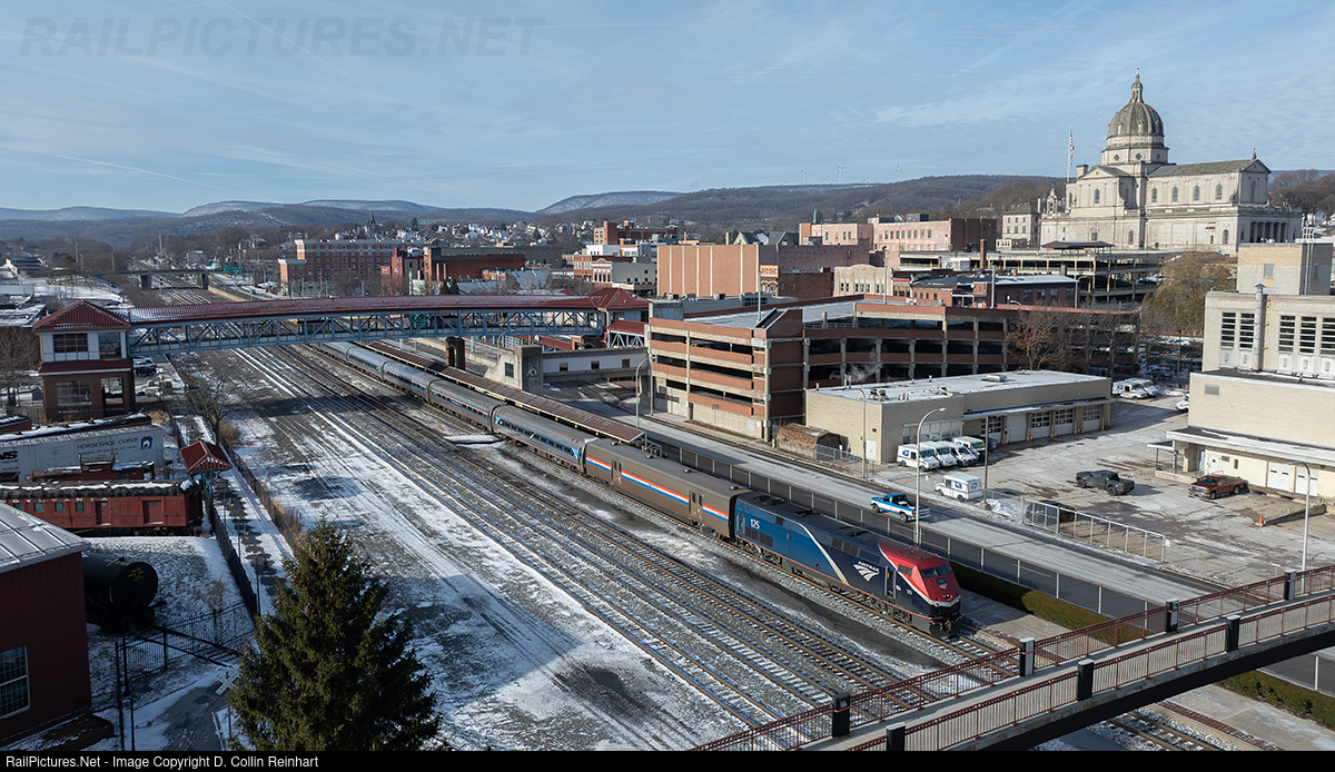 | Amtrak's Eastbound Pennsylvanian makes its morning station stop in Downtown Altoona with a Phase VII P42. After a day of rain, wind, and snow...the blue skies were a welcoming sight. |
