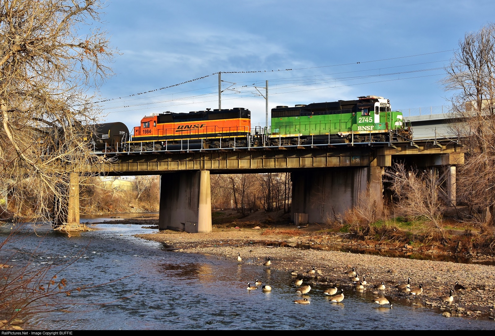 | BNSF 2745 (GP39E) leads a string of freight cars past a gaggle of geese sitting in the South Platte River in Denver, Colorado. |
