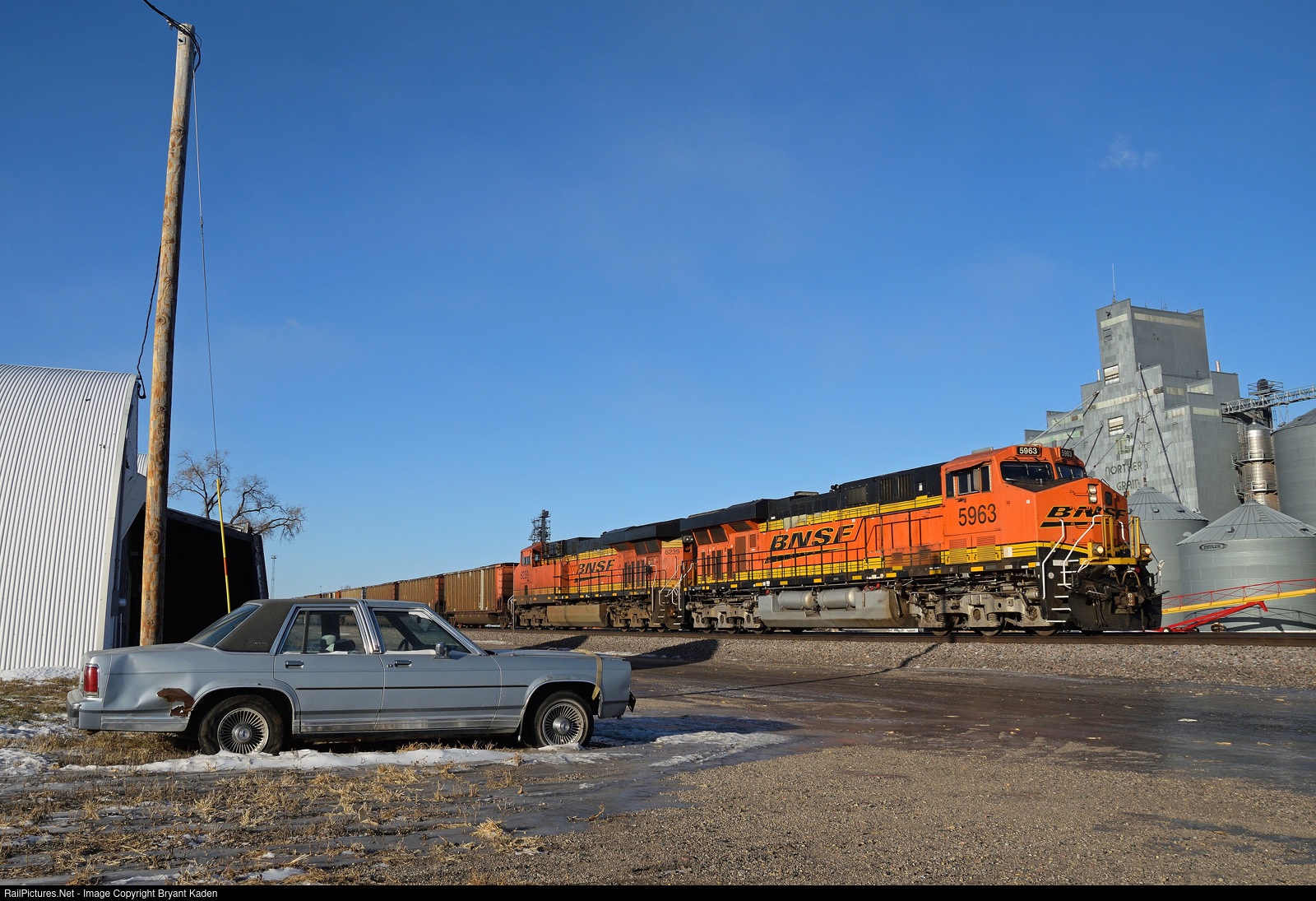 | An eastbound BNSF coal train gets underway after a crew change at Dilworth Yard, passing the venerable Northern Grain elevator and a well worn Ford LTD Crown Victoria. |