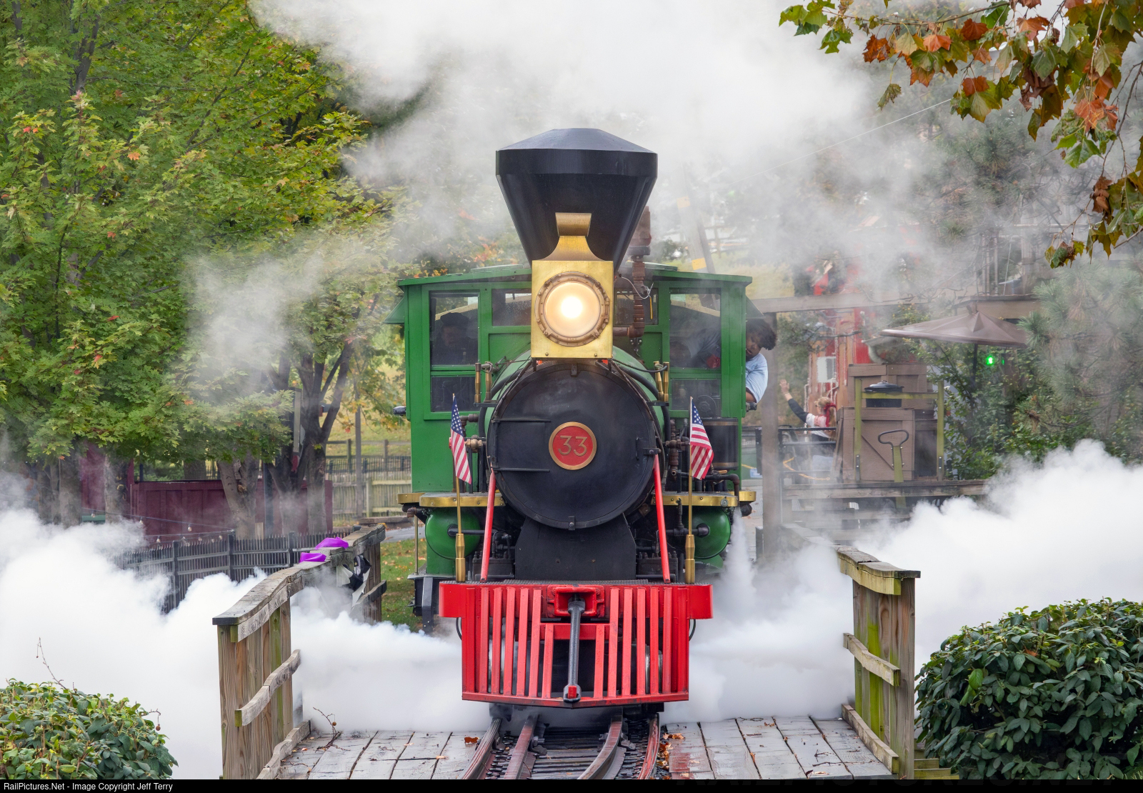 "Eli" is a full size, 3-foot-gauge steam locomotive built by Crown Metal Products in 1973 for Worlds of Fun in Kansas City, Missouri. The railroad was initially sponsored by Burlington Northern, who specified the green paint scheme that "Eli" still wears today. Crown built 21 of these 4-4-0s that were styled after St. Paul & Pacific "William Crooks" between the 1960s and 1980s for parks and attractions around the world. It is completely authentic save for the smoke, as "Eli" burns propane!