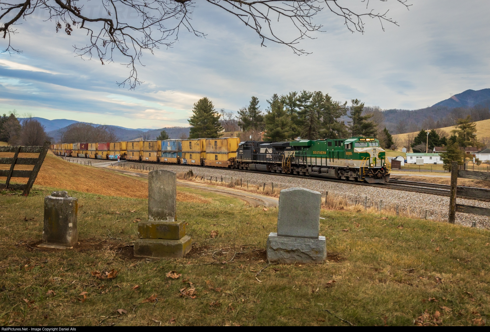 | The Southern heritage unit is in charge of NS M5T (extra 15T) as it heads west by the cemetery at John Farm in Shawsville, VA. |