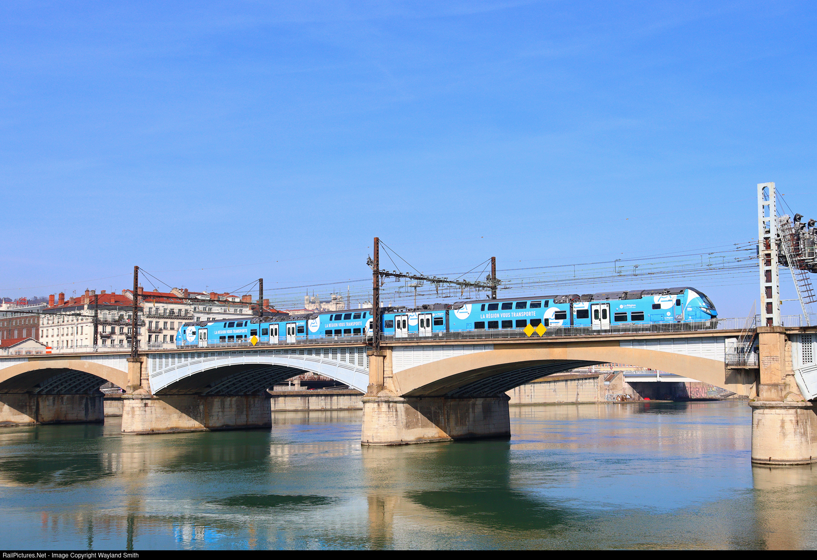 SNCF TER service crossing the Rhone, near Lyon Perrache.