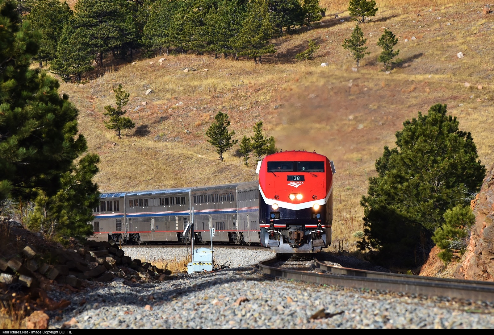 | Amtrak engine 138 (P42DC in Phase VII paint) leads the California Zephyr #5 train as it climbs the 2% grade out of Coal Creek Canyon towards Tunnel #1 at Plainview, Colorado.
