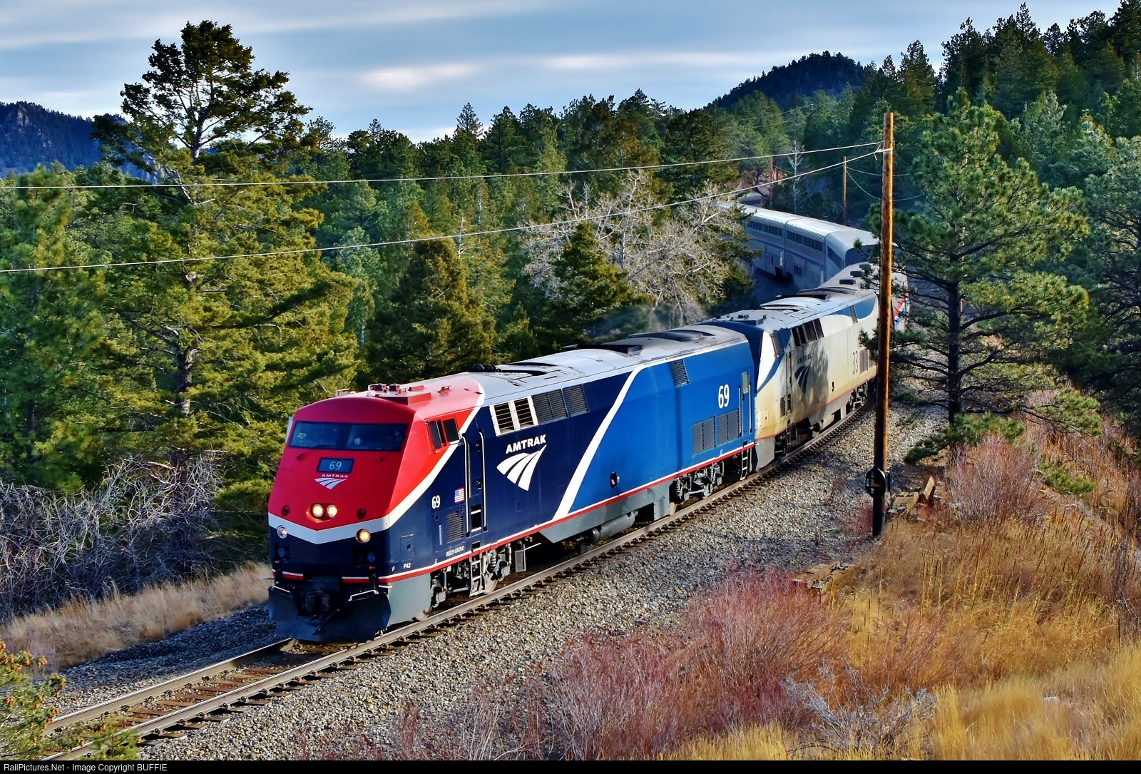 | A Phase VII painted engine #69 leads the California Zephyr through the trees at Crescent, Colorado as it heads west on the Moffat Tunnel Sub.