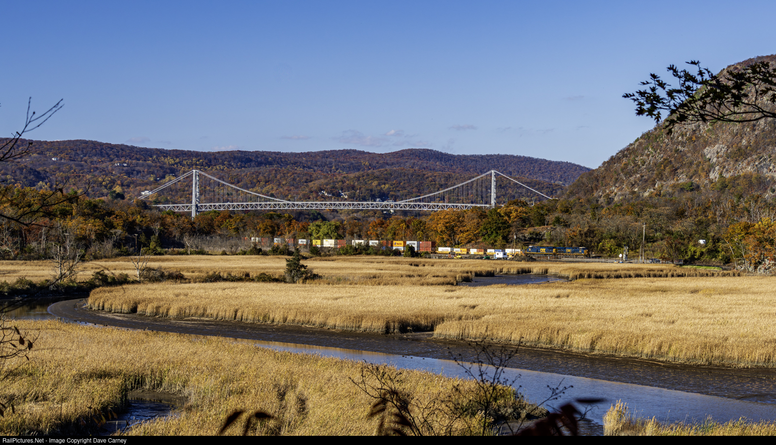 A CSX intermodal passes through Iona Island on a beautiful fall afternoon. The Bear Mountain Bridge can be seen in the background.