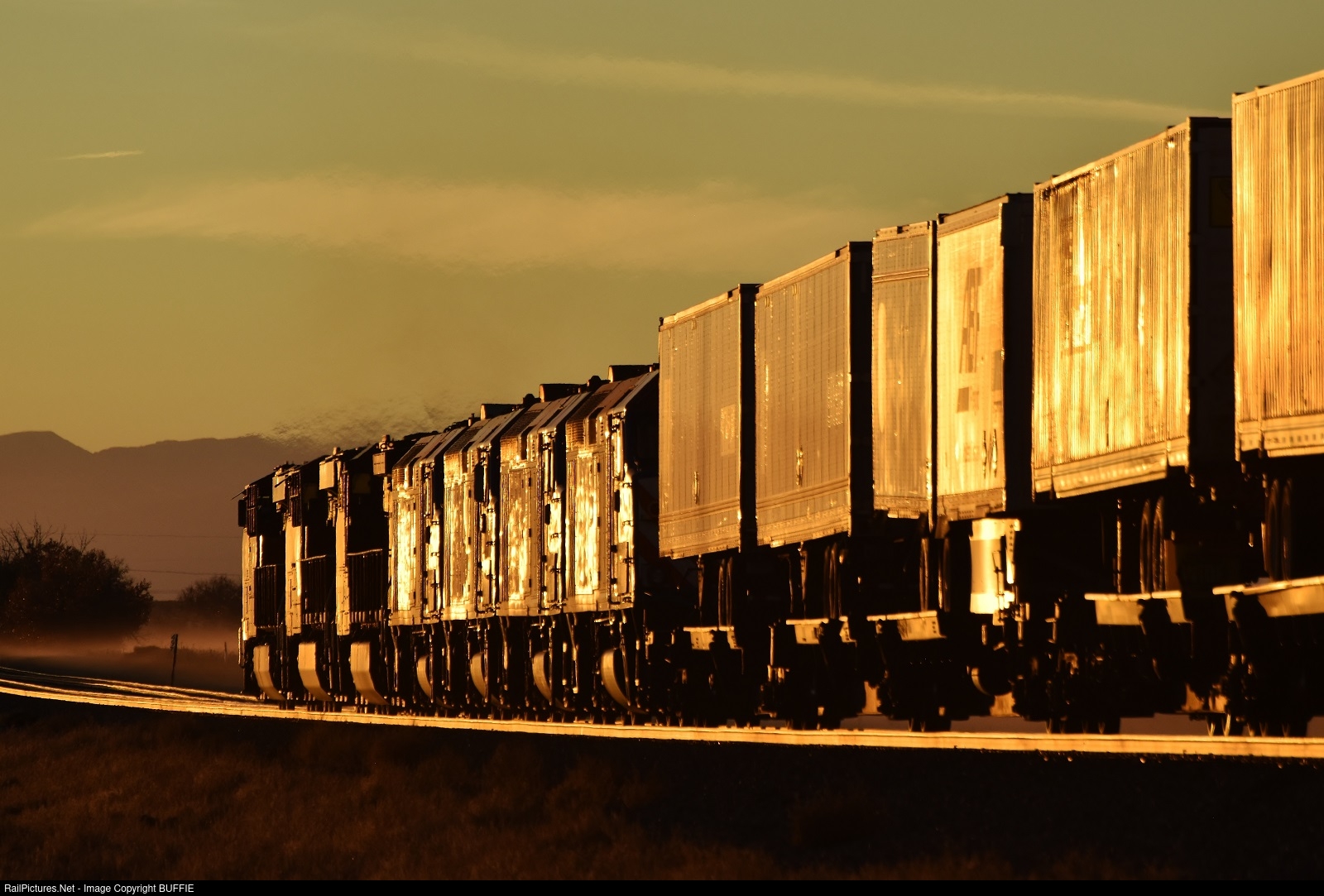 | A golden sunset reflects off of the BNS Z Train as it runs west on the Brush Sub through Roggen, Colorado. Included in the consist, aside from the stack cars, are 4 Metra F-40PH engines.