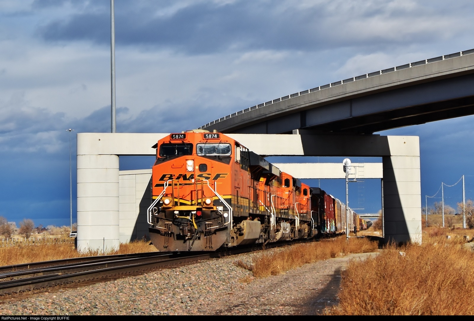 | BNSF 5874 (ES44AC) passes under Highway E-470 and leaves the storms behind as it pulls a manifest towards Denver, Colorado.
