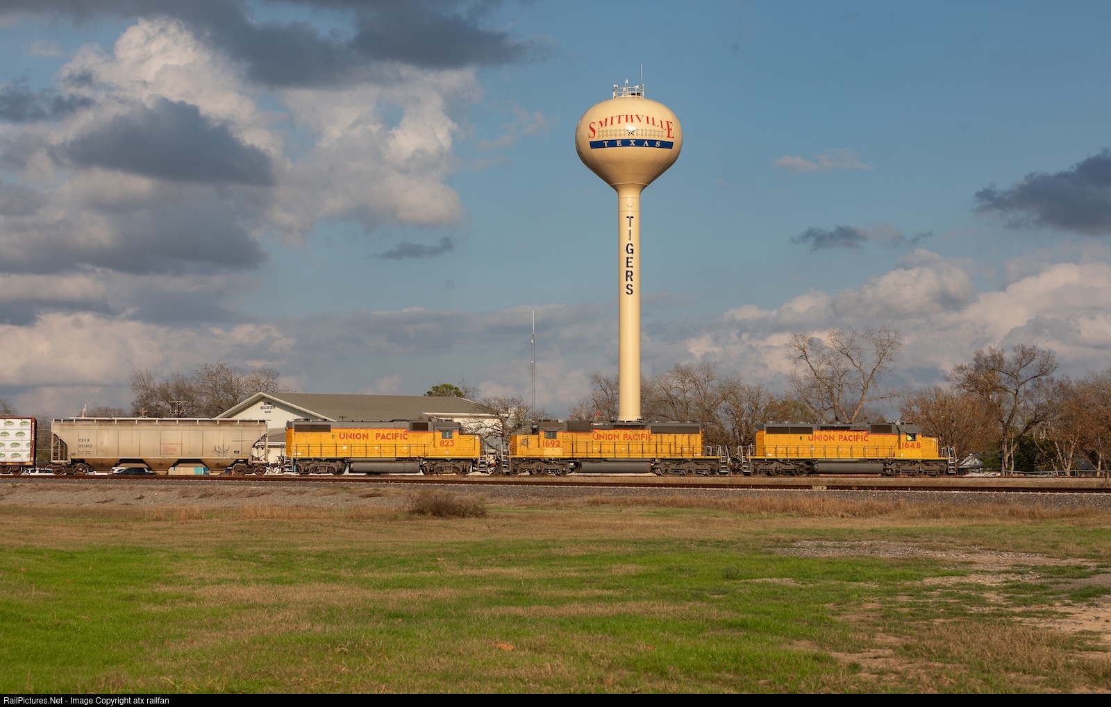 The LAW51 arrives in Smithville behind a trio of classic EMDs. The logo on the water tower makes Smithville's railroad heritage clear. Once a division point on the MKT, Smithville is quieter these days. That said, it's still a vital UP crew base and remains home to a small yard, used for classification for a separate local thats staged here.