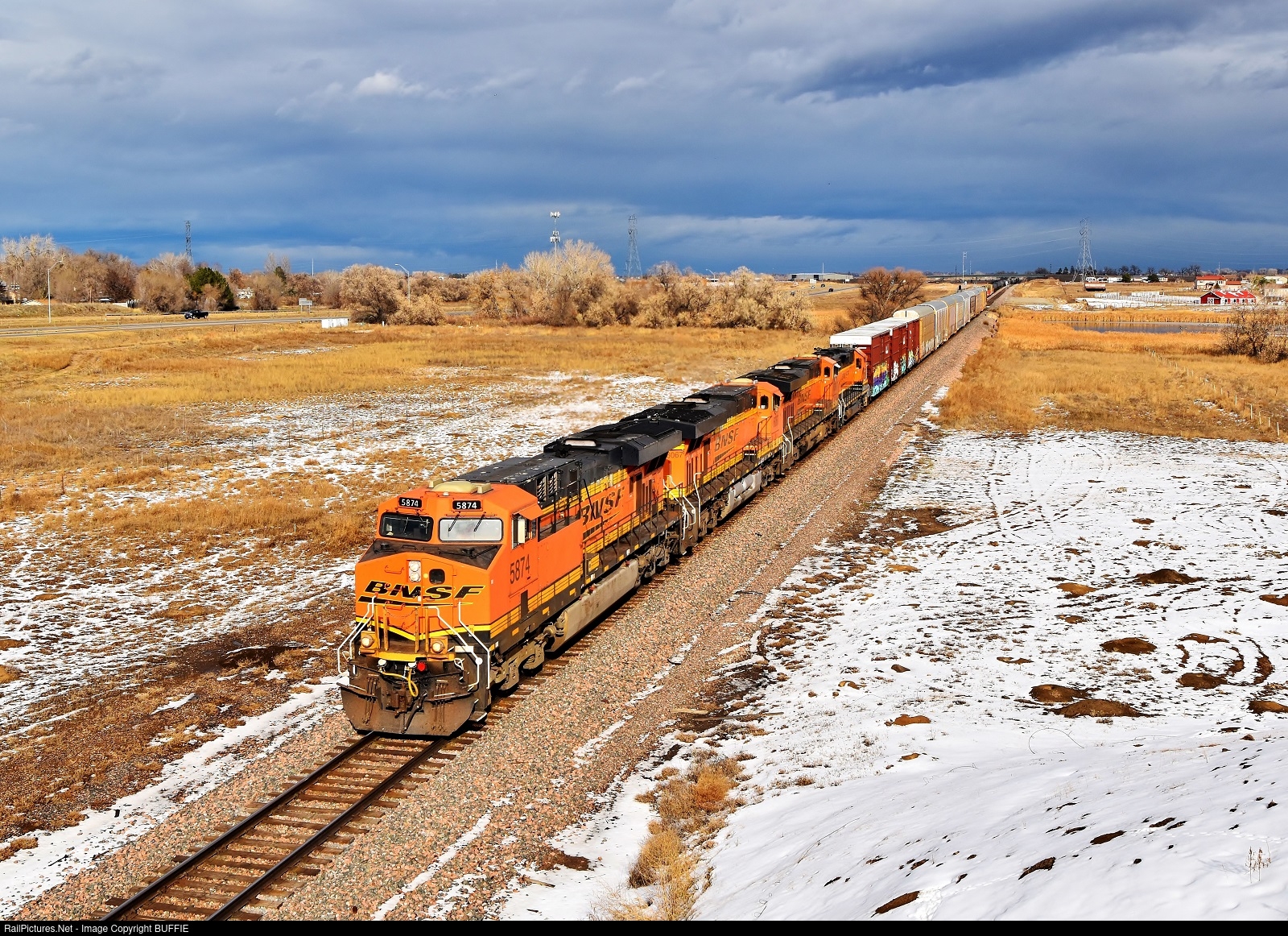 | Storm clouds brew in the east as BNSF 5874 (ES44AC) leads a manifest west on the Brush Sub towards Denver, Colorado.