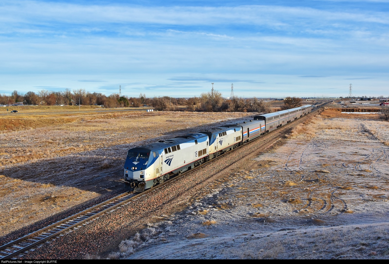 | Frost covers the grass as the California Zephyr runs west on the Brush Sub through Tonville, Colorado.
