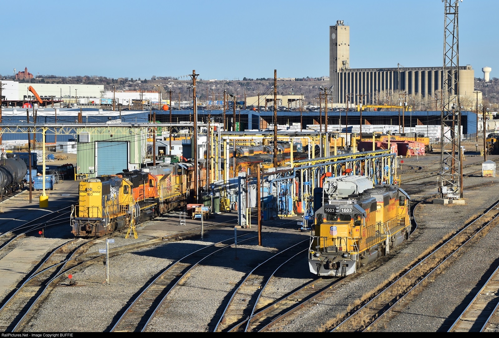 | Two BNSF motors, including a former ATSF Bluebonnet, sit in the Union Pacific's North Yard waiting for their turn at the servicing island.