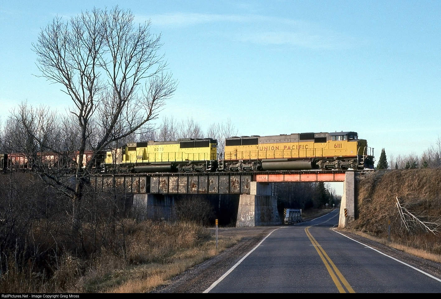 My how things have changed..... UP 6111 leads a C&NW ore train over the Hwy 86 bridge near Catawba, WI in November of 1990. These seasonal ore trains ran from the Twin Ports to Escanaba and used WC (ex-Soo) tracks for much of the east/west run across Wisconsin. Fast forward to 2025 and both the C&NW and the WC are gone. The dock in Escanaba is closed and these trains no longer run. This portion of the line between Ladysmith and Prentice doesn't see any traffic as it is out of service. Even Hwy 86 is gone, as bridge issues forced the highway to be rerouted and renamed Hwy O.
