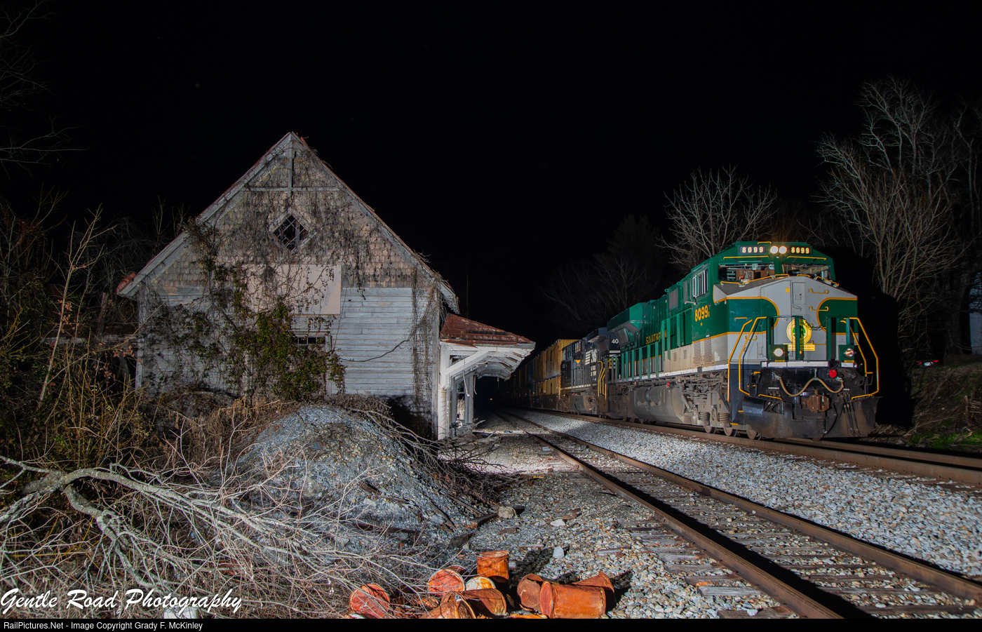 Norfolk Southern's M5T passes the former Southern Railway depot at Limestone, TN behind NS #8099 on a warm first day of Winter 2025.